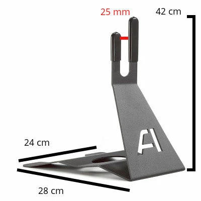 Fabriquée en acier, cette structure robuste est munie de pattes en caoutchouc qui permettent d’accrocher le vélo par le coté sans risquer d’endommager le cadre. Il suffit d’accrocher le moyeu de la roue pour maintenir le vélo immobile, stable et droit. Il s’agit d’un support universel, compatible avec des freins à disque. Ce dispositif de rangement vélo est particulièrement adapté pour un vélo lourd, pesant plus de 20 kilos, comme un vélo électrique par exemple. Il peut également servir de pied d’atelier lors l’entretien du cycle. Le support pèse 2,66 kg et a pour dimensions : 28 x 24 x 42 cm.